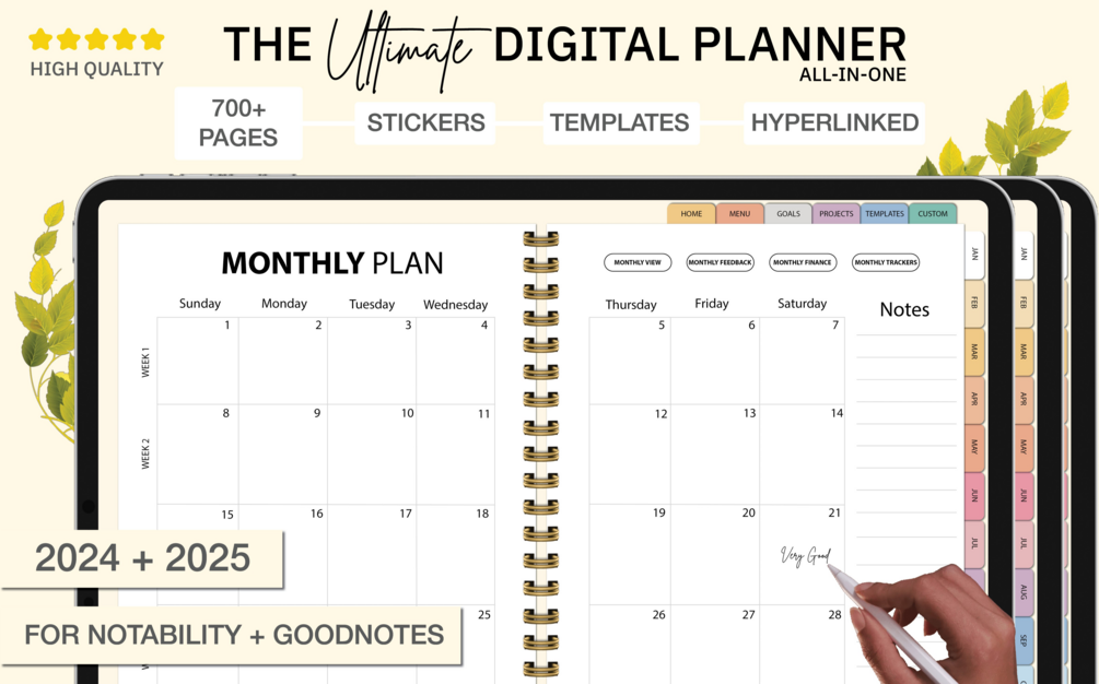 It also includes a variety of customizable templates, digital planner icons, and digital planner stickers for business, allowing you to personalize and tailor your planner to your specific needs. The ultimate digital planner for iPad users, it is compatible with GoodNotes, Notability, Samsung Notes, Collanotes, Xodo, and other similar apps.